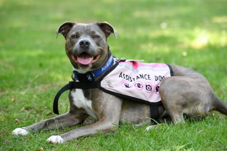 A two year old Staffordshire Bull Terrier, trained to support her owner, Amee, through autism, OCD and anxiety.